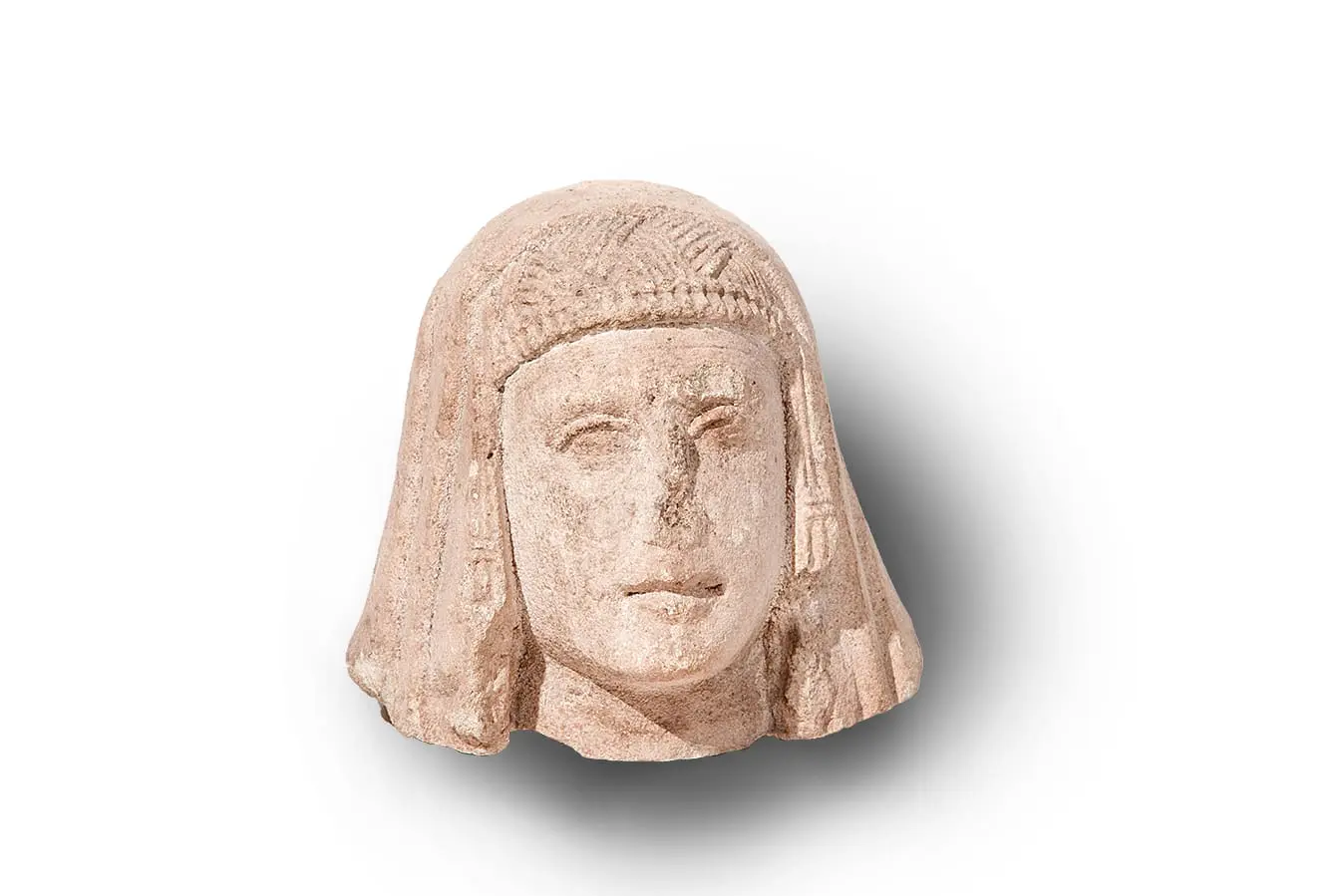 Se trata de una figura de tamaño mediano, de la cual solo se conserva la cabeza. En esta imagen están trabajadas la zona frontal y las laterales. Tiene una expresión serena y está cubierta por un manto, bajo el mismo presenta una diadema con motivos en zigzag, y de él cuelga una línea de cuentas esféricas. “En los laterales del manto, encontramos las carrilleras, piezas triangulares a ambos lados de la cara. Esta escultura está realizada en piedra arenisca local, entre amarillento y blanquecino, que podía tallarse con mucha facilidad”, explicó Leticia Pertegal, quien en esta ocasión ha elaborado la ficha técnica de la pieza.