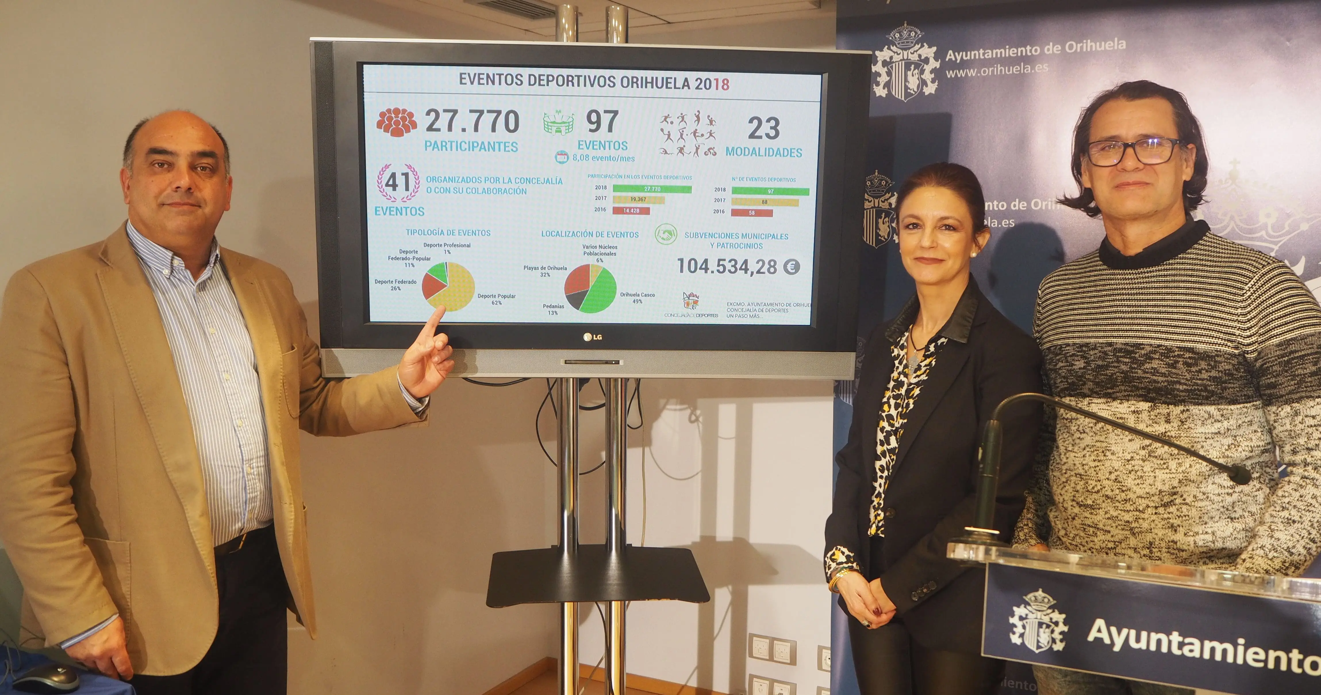 El concejal de Deportes del Ayuntamiento de Orihuela, Víctor Valverde, dio a conocer este miércoles el informe de eventos deportivos del año 2018 del municipio. “Se trata de unos datos que ponen de manifiesto la implicación de esta Concejalía y todas las asociaciones o clubes que intervienen en el deporte de nuestro municipio”. El edil estuvo acompañado por M.ª Dolores Castejón, representante de la Asociación Cáncer de Páncreas, y Ximo Rubert, director técnico de la Carrera de las Ciudades Contra el Cáncer de Páncreas, uno de los eventos deportivos más destacados del año.
