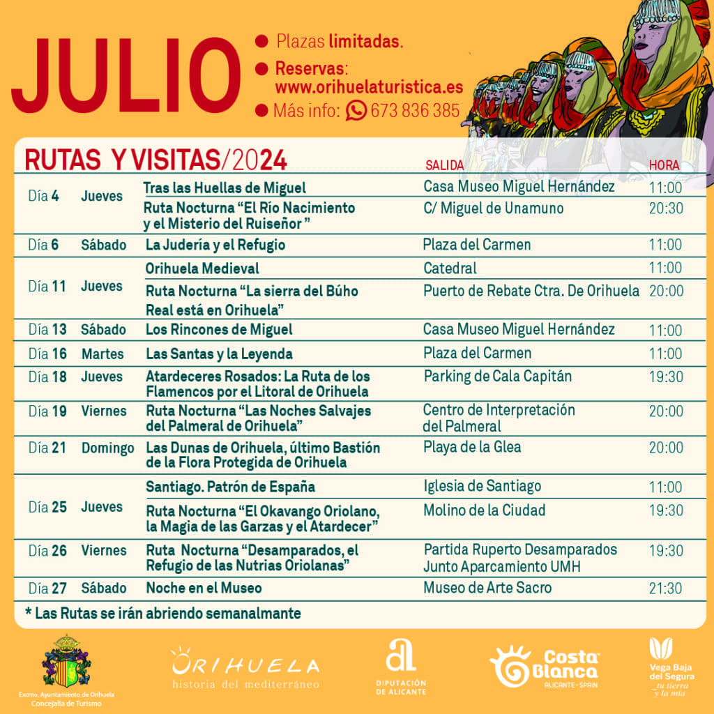 Entre las rutas culturales destaca, «Tras las Huellas de Miguel» y «Los Rincones de Miguel«, el jueves 4 de julio y el sábado 13 de julio respectivamente, dedicadas a la figura del poeta oriolano Miguel Hernández. También se llevarán a cabo recorridos temáticos en la semana de las fiestas de la Reconquista de Moros y Cristianos, como “Las Santas y la Leyenda” el martes 16 de julio, y “Santiago, Patrón de España” el jueves 25 de julio, que ofrecerán a los visitantes una inmersión en la rica historia de Orihuela.
