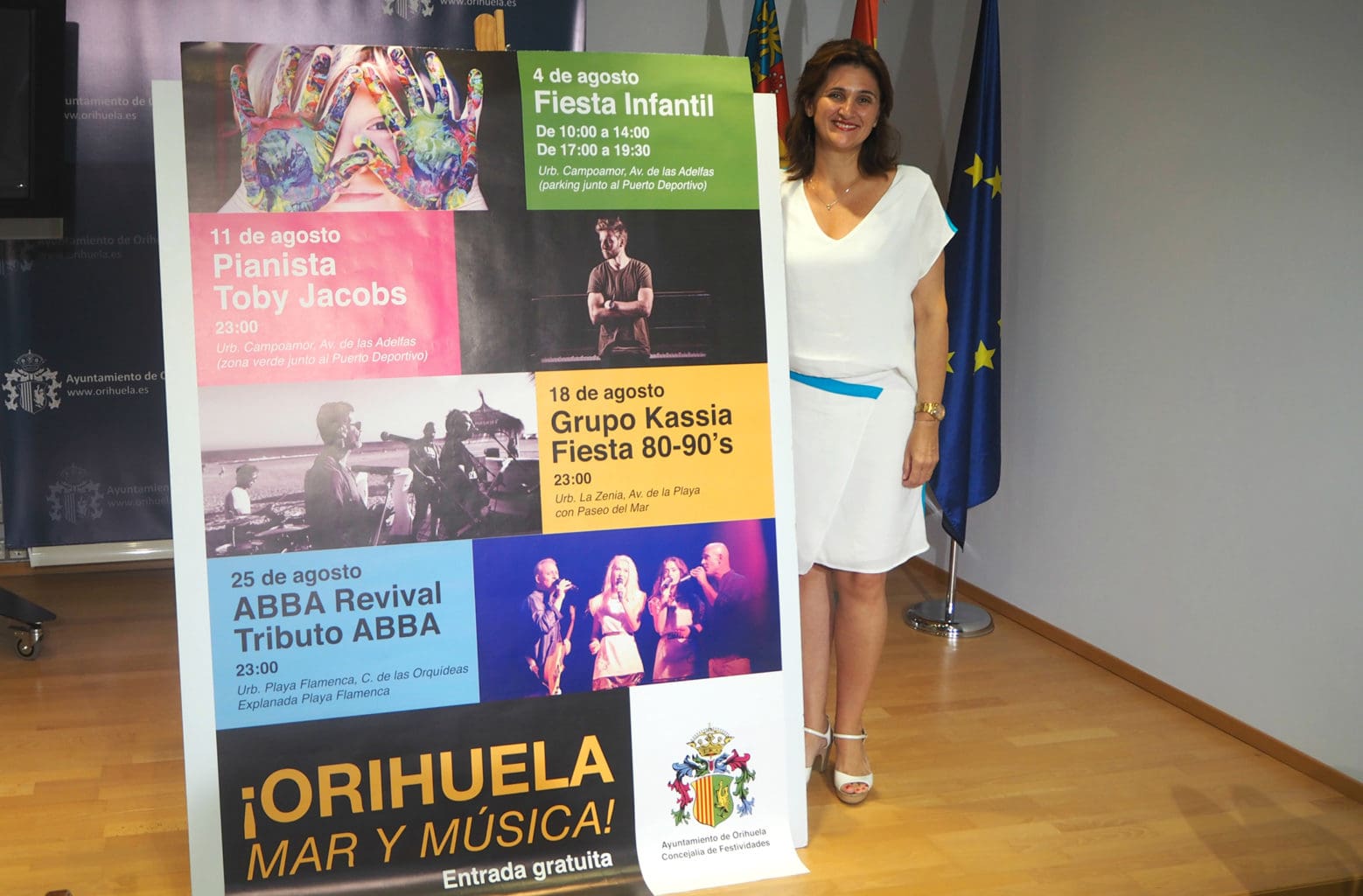 La concejal de Festividades, Mariola Rocamora, presentó este martes la primera edición de ¡Orihuela, mar y música!, una programación de conciertos y actividades infantiles que tendrán lugar todos los sábados de agosto en Orihuela Costa. “Se trata de amplia programación para todos los públicos en la que la música es la protagonista y en la que ofrecemos conciertos y actividades gratuitas durante todos los fines de semana”,avanzó la edil.