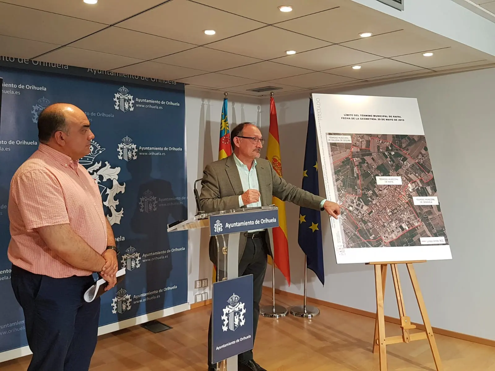 El concejal de Patrimonio del Ayuntamiento de Orihuela, Rafael Almagro, junto al concejal de Pedanías, Víctor Valverde, ha informado este lunes sobre los resultados del informe que el Instituto Geográfico Nacional a través del Registro Central de Cartografía, que es el organismo que certifica las líneas de deslindes entre diferentes términos, ha emitido respecto al conflicto de competencias que surgió hace algunas semanas entre Orihuela y Rafal.