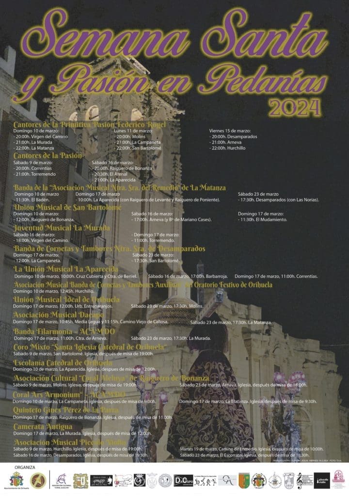 Este año “Semana Santa y Pasión en pedanías” ha contado con la participación de los Cantores de la Primitiva Pasión “Federico Rogel”, Cantores de la Pasión, Banda de la “Asociación Musical Ntra. Sra. de. Remedio” de La Matanza, Unión Musical de San Bartolomé, Juventud Musical La Murada, Banda de Cornetas y Tambores Ntra. Sra. de Desamparados, Unión Musical La Aparecida, Asociación Musical Banda de Cornetas y Tambores Auxilium del Oratorio Festivo de Orihuela, Unión Musical Ideal de Orihuela, Asociación Musical Dacapo, Banda Filarmonía-ACAMDO, Coro Mixto