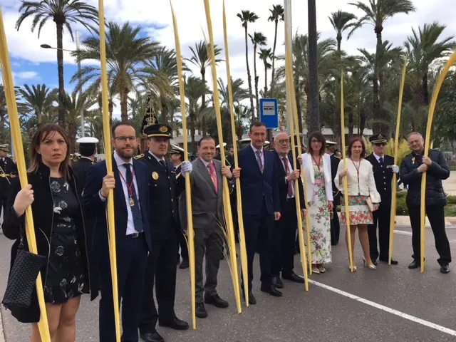 Miles de ilicitanos han acompañado con las tradicionales palmas blancas -lisas, rizadas o de solapa- a la imagen de Jesús Triunfante, durante la multitudinaria procesión del Domingo de Ramos de Elche, que marca el inicio de la Semana Santa.