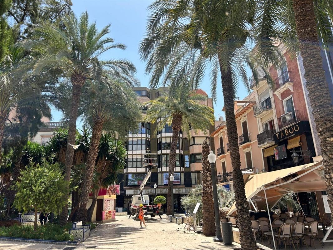 Una palmera de La Glorieta de Elche se ha partido en dos y ha caído sobre una de las terrazas de hostelería que se ubican en la plaza. El ejemplar sufría una malformación del tronco sumada a estrés hídrico, «lo que ha provocado que el tronco se rompiera y haya caído».