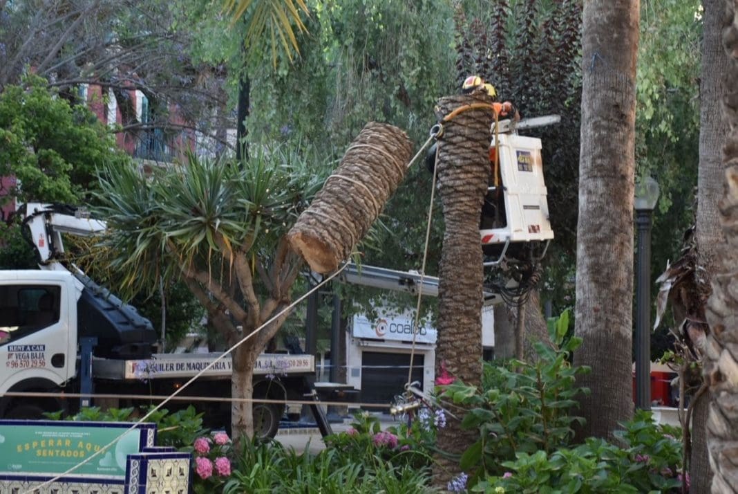 Tras la tala de la palmera se ha procedido a su retirada inmediata para que no afecte al resto de ejemplares de la Glorieta.