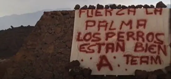 En el video, de apenas minuto y medio de duración se ven unas imágenes grabadas sobrevolando la zona donde estaban atrapados los perros y una pancarta blanca con letras rojas que dice: «Fuerza La Palma. Los perros están bien». El mensaje va firmado para-Team, el equipo A.