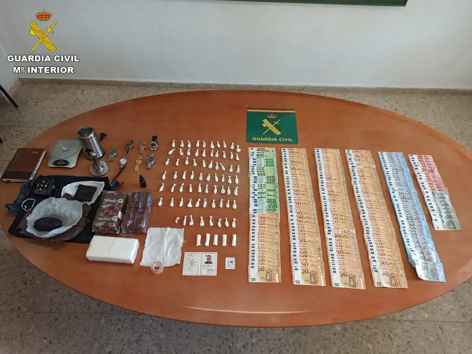 De igual forma se incautaron los siguientes efectos: 12.270 euros en metálico fraccionados en diversos billetes, 3.878 euros en criptomonedas de un monedero digital, aproximadamente 500 gramos de sustancia de corte (glucosa), 7 relojes de alta gama y 74 dosis de cocaína de aproximadamente un gramo cada una.