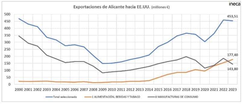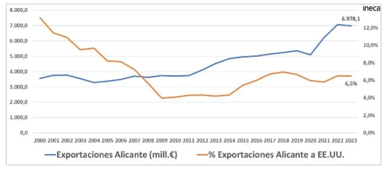 La relación comercial entre Alicante y Estados Unidos ha sufrido sus altibajos en las últimas dos décadas. En la actualidad, las exportaciones a este país representan el 1% del PIB provincial. A principios de siglo superaban el 13% del total de las exportaciones alicantinas y 23 años después el peso ha caído hasta el 6,5%, según datos del Ministerio de Industria. Este cambio está directamente relacionado con el incremento de ventas a la Unión Europea, según ha manifestado el autor del informe, Francisco Llopis, director de Estudios de INECA.