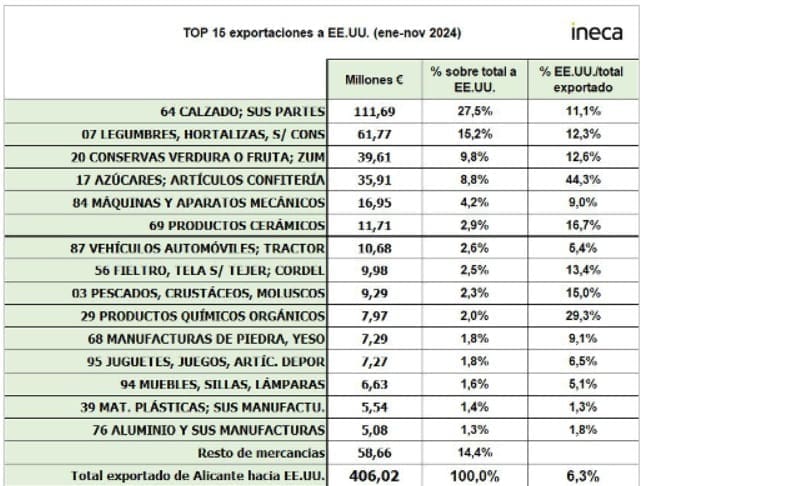 El Instituto de Estudios Económicos de la provincia de Alicante (INECA) ha realizado un microinforme sobre el impacto de las exportaciones de las empresas alicantinas a Estados Unidos y el número de empleos relacionados con ellas para conocer cómo afectaría el incremento de aranceles que ha anunciado el presidente de EEUU, Donald Trump. La provincia de Alicante es la decimosegunda provincia española que exporta a Estados Unidos con 406 millones de euros, muy por detrás de Barcelona, Madrid, Valencia y Castellón, aunque el volumen de exportaciones de Alicante hacia este país da trabajo a unas 1.800 personas de manera directa, en su mayoría del sector del calzado y agroalimentario, más el empleo inducido de otras empresas que dan servicio a éstas.