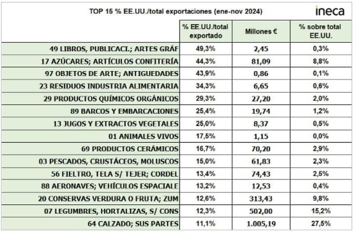 Si se produjera un aumento de los aranceles por parte de Estados Unidos a los productos españoles, habría algunos sectores que se verían seriamente afectados no por el volumen total, que también, sino porque el mercado estadounidense es su principal destino exportador. Así ocurre con los libros, publicaciones y artes gráficas que exportan sólo 2,45 millones de euros a Estados Unidos, pero supone casi la mitad de su facturación exportadora. Le seguiría en importancia los azúcares, anteriormente coitados, y las antigüedades y objetos de arte que venden a este mercado el 43,9% aunque el valor de lo exportado no llega a los 900.000 euros.