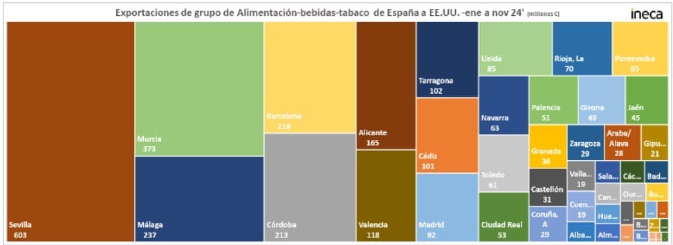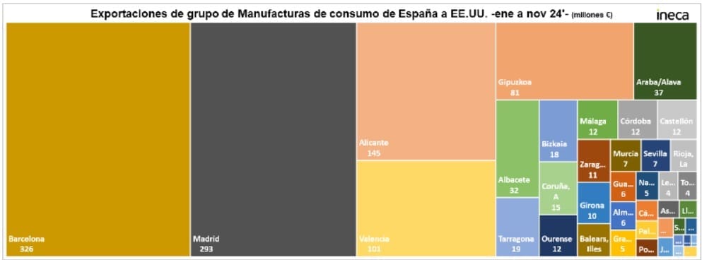 Las exportaciones de España hacia Estados Unidos (EEUU) en el periodo de enero a noviembre del 2024 -últimos datos de los que se disponen- ascienden a 16.466,44 millones de euros. Los dos grupos de productos más exportados desde Alicante son los vinculados con la agricultura y las manufacturas de consumo. El primer grupo exporta desde España un total de 3.116,85 millones de euros, con el siguiente desglose provincial, donde Alicante aparece en la sexta posición con 165 millones de euros: