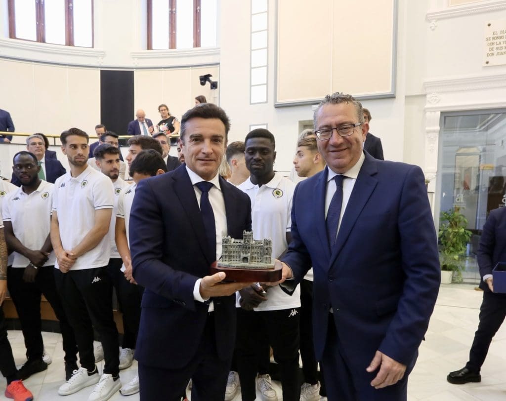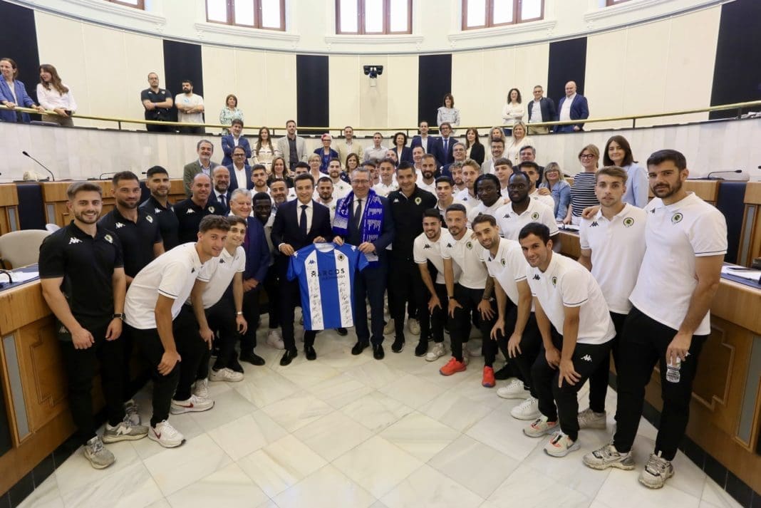 El presidente de la Diputación de Alicante, Toni Pérez, ha recibido esta mañana en el Palacio Provincial a los integrantes del Hércules CF tras su ascenso el pasado domingo a Primera RFEF en un Rico Pérez abarrotado con cerca de 30.000 personas.