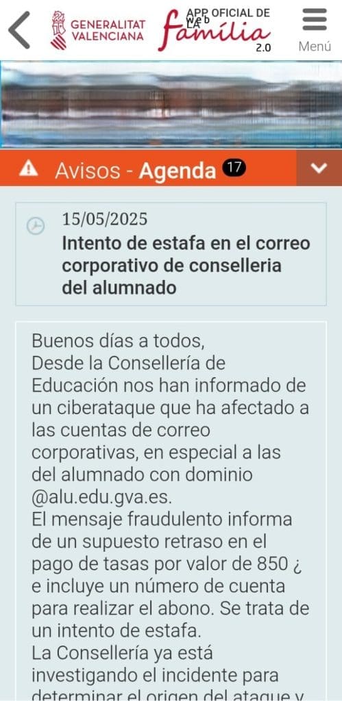 Las familias del Conservatorio Profesional de Música Mestre Tárrega han recibido un aviso urgente: se ha detectado una posible estafa a través de los correos institucionales del alumnado, con dominio @alu.edu.gva.es. El mensaje fraudulento informa de un supuesto retraso en el pago de tasas por valor de 850 euros e incluye un número de cuenta para realizar el ingreso.