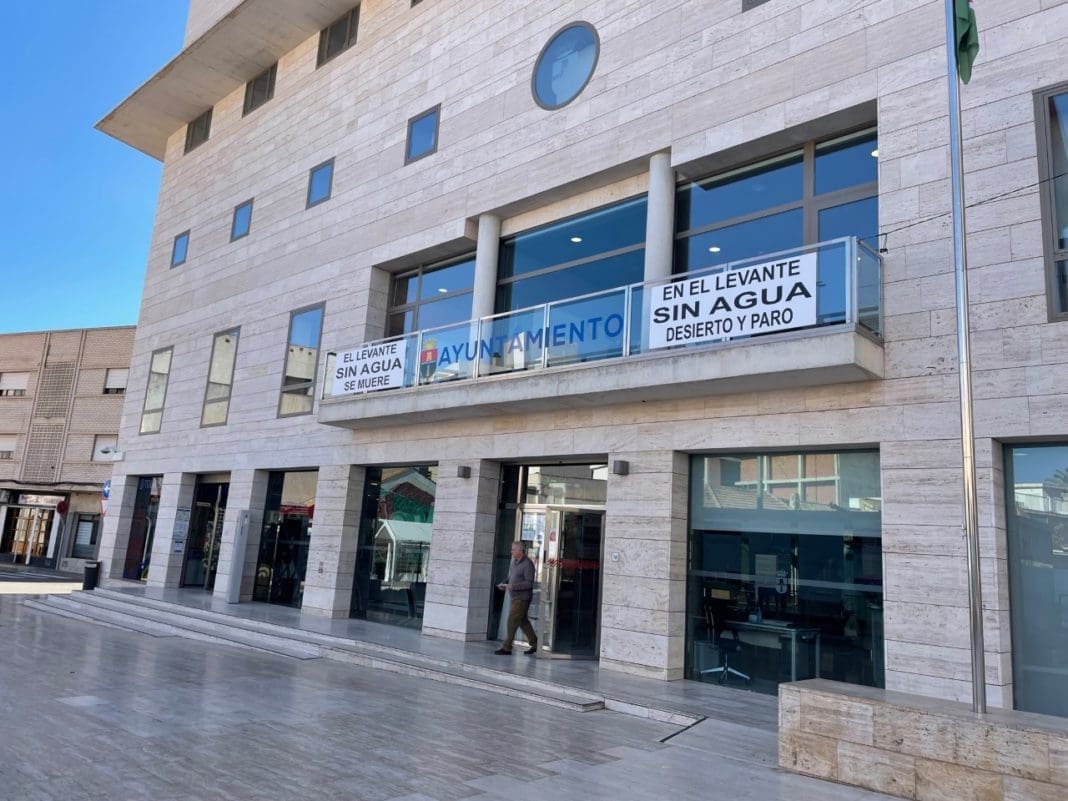 El Ayuntamiento de Pilar de la Horada ha instalado en el balcón del edificio consistorial dos carteles gigantes reivindicando agua para el levante español, con los mensajes: “el levante sin agua se muere” y “en el levante sin agua desierto y paro”.