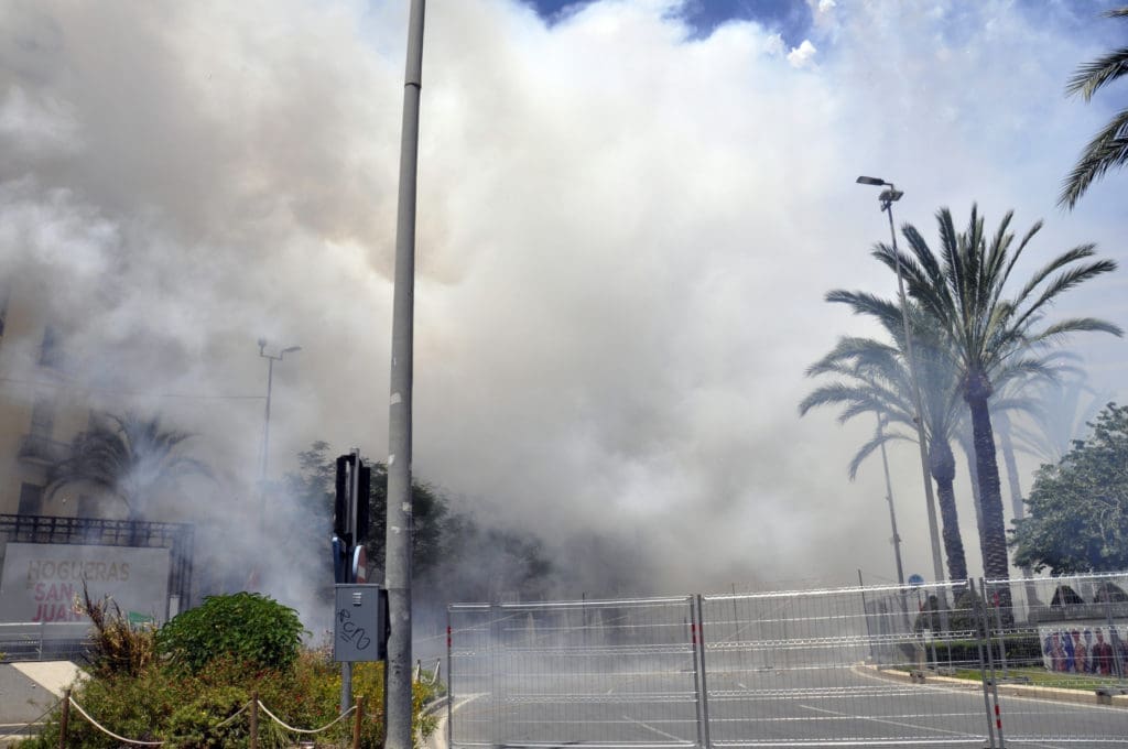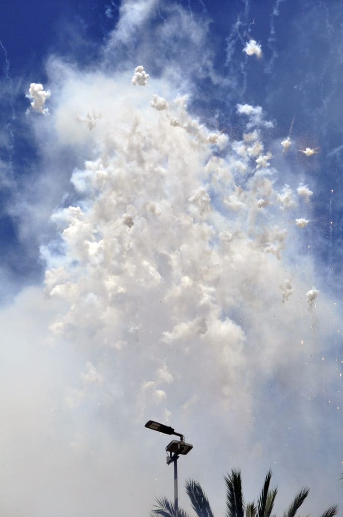 El espectáculo ha tenido un sorprendente comienzo aéreo, con trazas de colores y cohetes que explotaban de forma acompasada sobre un cielo azul radiante. Un suave viento ha hecho agradable la espera y ha extendido el espeso humo de la pólvora sobre toda la plaza.