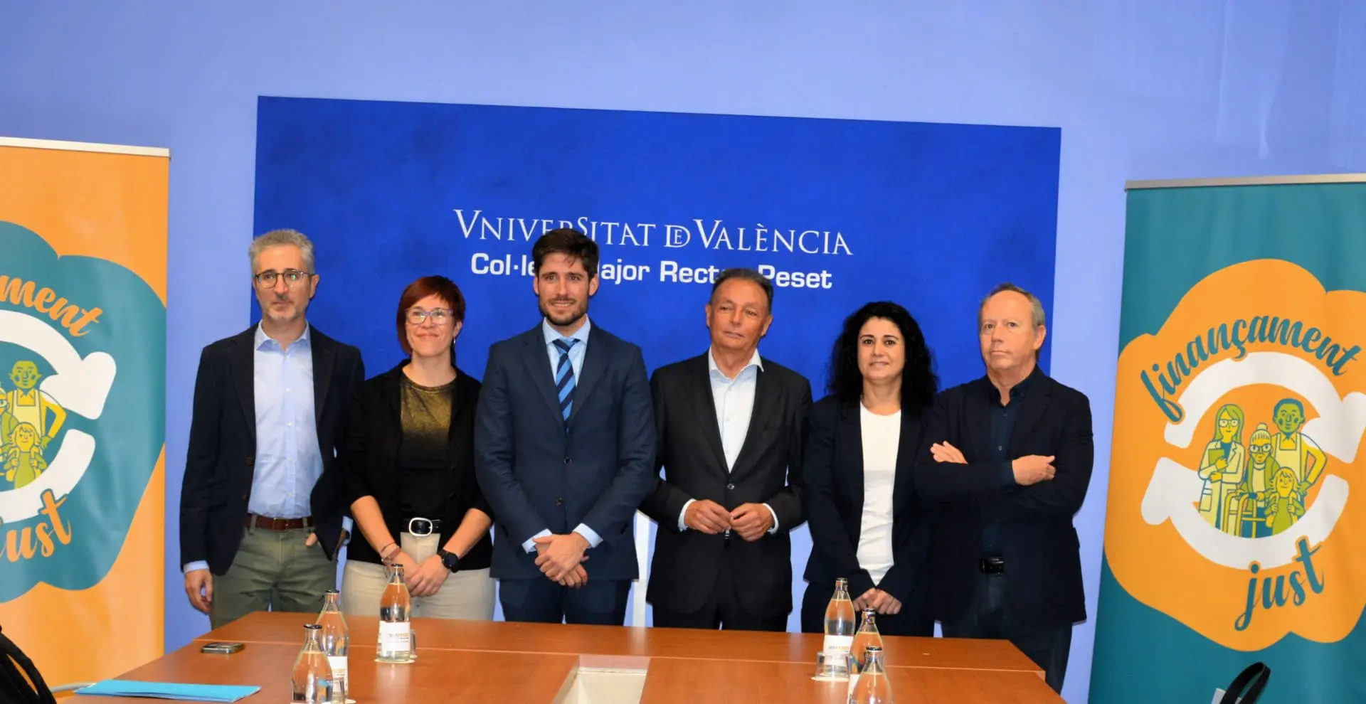 La secretaria general de CCOO-PV, Ana García Alcolea; el secretario general de UGT-PV, Ismael Sáez; el presidente de la CEV, Salvador Navarro, el coordinador general del PPCV, Juan Carlos Caballero; el portavoz adjunto del PSPV-PSOE Arcadi España y la portavoz de Compromís, Àgueda Micó, han vuelto a reclamar de forma «unida» la reforma del modelo de financiación autonómica, la exigencia de inversiones acordes al peso poblacional y la condonación de la deuda provocada por la infrafinanciación.