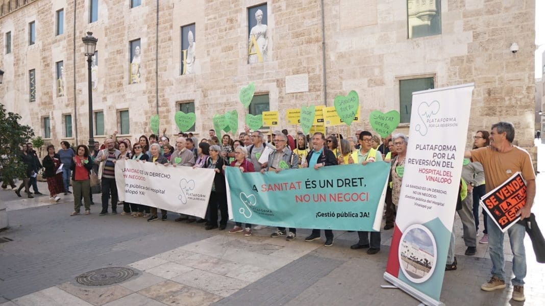 La Plataforma por la reversión del Vinalopó se ha concentrado en la mañana de hoy miercoles a las puertas de las Corts Valencianes donde señalan que han reunido a un centenar de personas de Aspe, Crevillente, Elche, Hondón de las Nieves y Hondón de los Frailes. Exigen al gobierno valenciano la reversión a la gestión pública del único departamento de salud privatizado de la Comunidad Valenciana.