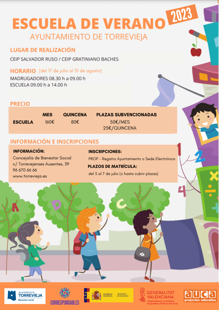 El concejal de Bienestar Social del Ayuntamiento de Torrevieja, Óscar Urtasun, informa que la Escuela de Verano Municipal 2023 se desarrollará desde el 17 de julio hasta el 31 de agosto en los centros educativos CEIP Salvador Ruso y CEIP Gratiniano Baches, para todos los niños que en el curso 2022/2023 hayan estado escolarizados en Educación Infantil o Primaria, empadronados en Torrevieja o cuyo padre/madre/tutor esté empadronado en el municipio.
