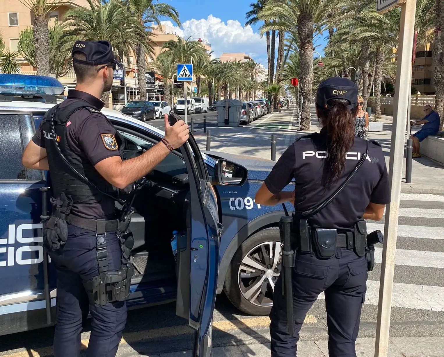 Personados en el lugar, cuatro agentes adscritos al Grupo de Atención al Ciudadano y al Grupo Operativo de Respuesta de la Comisaría de Policía Nacional en Elche, se encuentran en la vía pública a dos varones, uno de los cuales presentaba un gran corte en el antebrazo izquierdo, por el que sangraba abundantemente, mientras el otro intentaba socorrerle sin éxito.