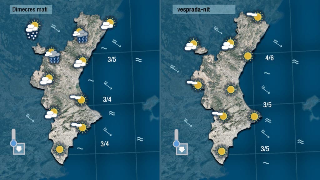 En el norte y por el interior las temperaturas también serán primaverales pero al llegar la tarde-noche se reforzará el viento, el cielo quedará más cubierto e incluso podrán caer las primeras lluvias del año (no descarto que también se puedan ver los primeros copos de nieve del 2022 en las cumbres más altas de Castelló).
