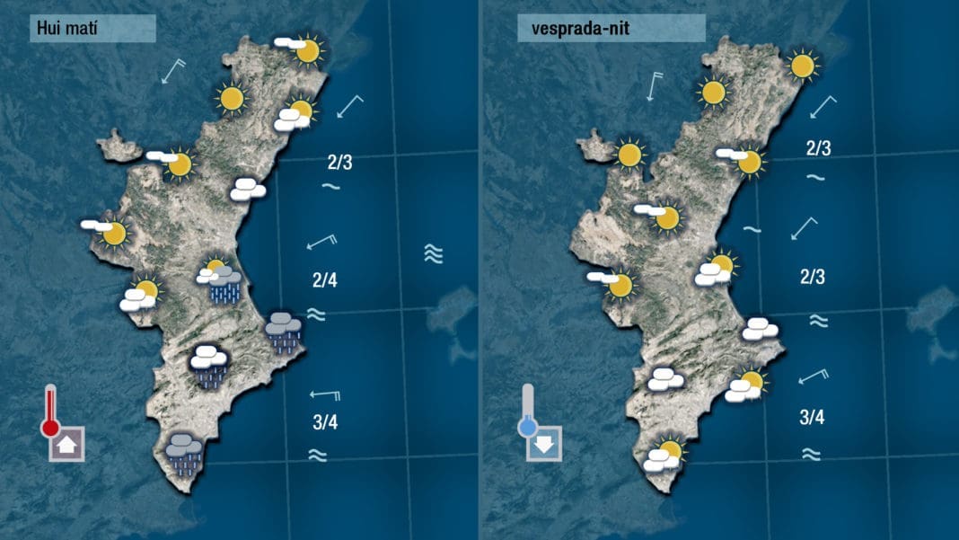 A primera hora, la nubosidad será abundante en las zonas más costeras de la mitad sur de la Comunitat con lloviznas débiles que podrán afectar desde la ciudad de València hasta el sur de Alicante. Precisamente es en el sur donde la probabilidad de lluvias de entidad es más alta. Esta tarde las nubes todavía dejarán el cielo cubierto en el sur pero será difícil que lleguen a dejar lluvia.