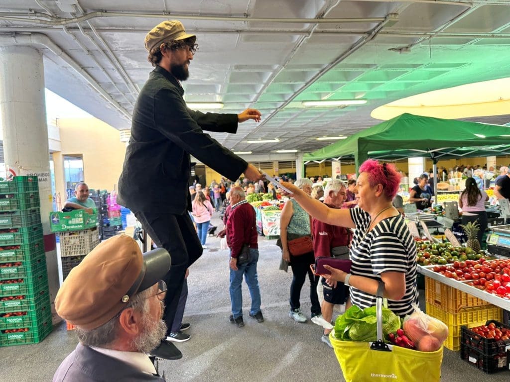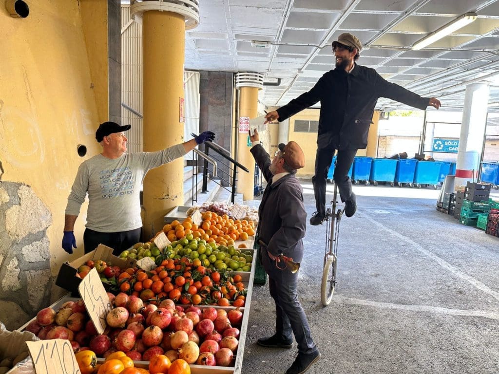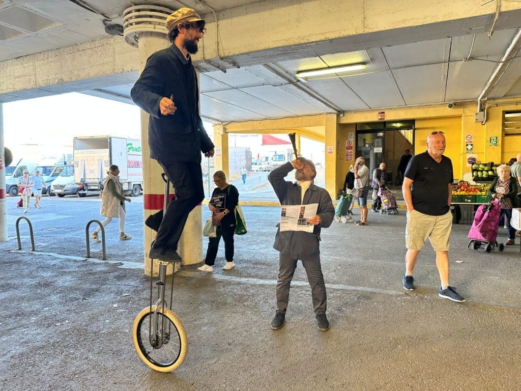 Para ello, aprovechando la celebración, los miércoles, del Mercado Municipal o ‘mercadillo’, por el que pasan cada semana miles de personas, David y Adrián, “Los hermanos Bardini”, integrantes de la compañía ‘Circarte’, acuden al recinto ataviados con vestimenta de época propia de los pregoneros, su trompetilla y su primitivo megáfono (todo muy vintage), y a voz en grito comunican la programación mientras reparten folletos con toda la explicación. Uno a pie de mercado, y el otro sobre una biciclo de dos metros de altura, haciendo gala de sus habilidades circenses.