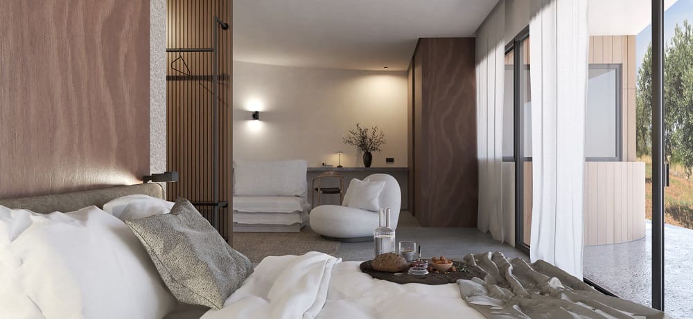 Los alojamientos están concebidos como ‘eco-friendly’, modulares y son de diseño único y patentado. La parcela, además, colinda con una zona rural protegida municipal con un suelo no urbanizable de protección ecológica, por lo que las suites se construirán elevadas sobre el terreno, para no dejar huella a posteriori.