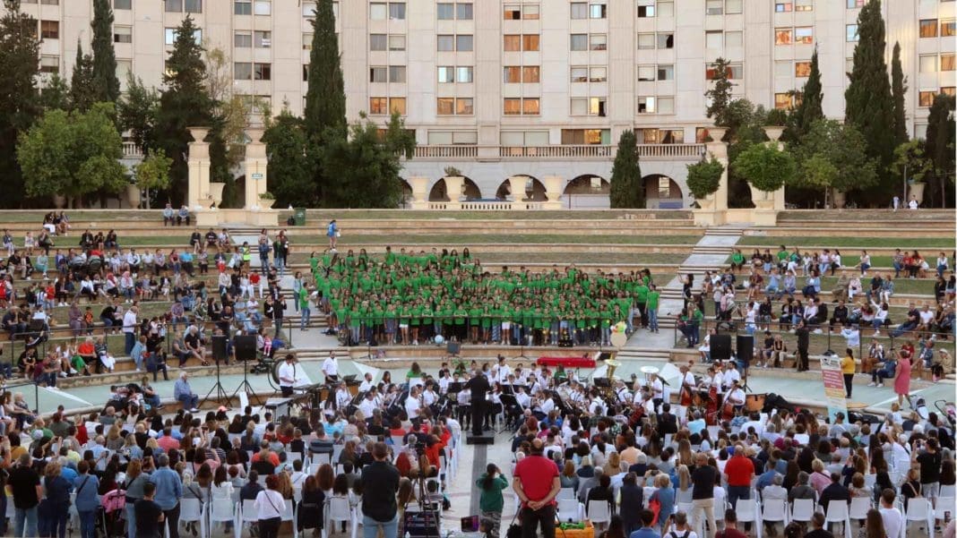 Cerca de 400 estudiantes de Primaria de cinco colegios de Benidorm, junto a la Unión Musical, ofrecieron ayer un concierto en el auditorio Julio Iglesias del Parque de l’Aigüera como cierre a la primera participación de la ciudad en el proyecto ‘L’escola canta’.