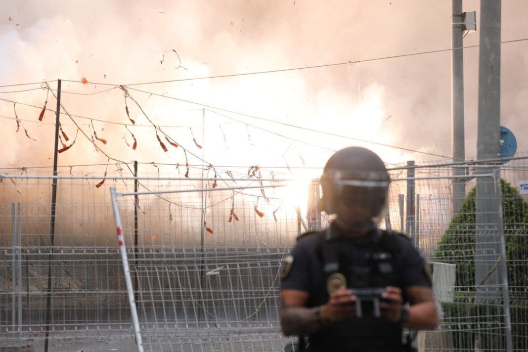 La parte terrestre la han compuesto seis fases, acompañadas de otras tantas aéreas. El sonoro y fuerte terremoto, que ha levantado la ovación unánime de los espectadores que se han congregado en el perímetro de la plaza, ha dado paso al bombardeo final, con una pantalla digital y un golpe hermético, a base de roncadoras y truenos, con el que ha finalizado el disparo después de que estallara el trueno de aviso final.