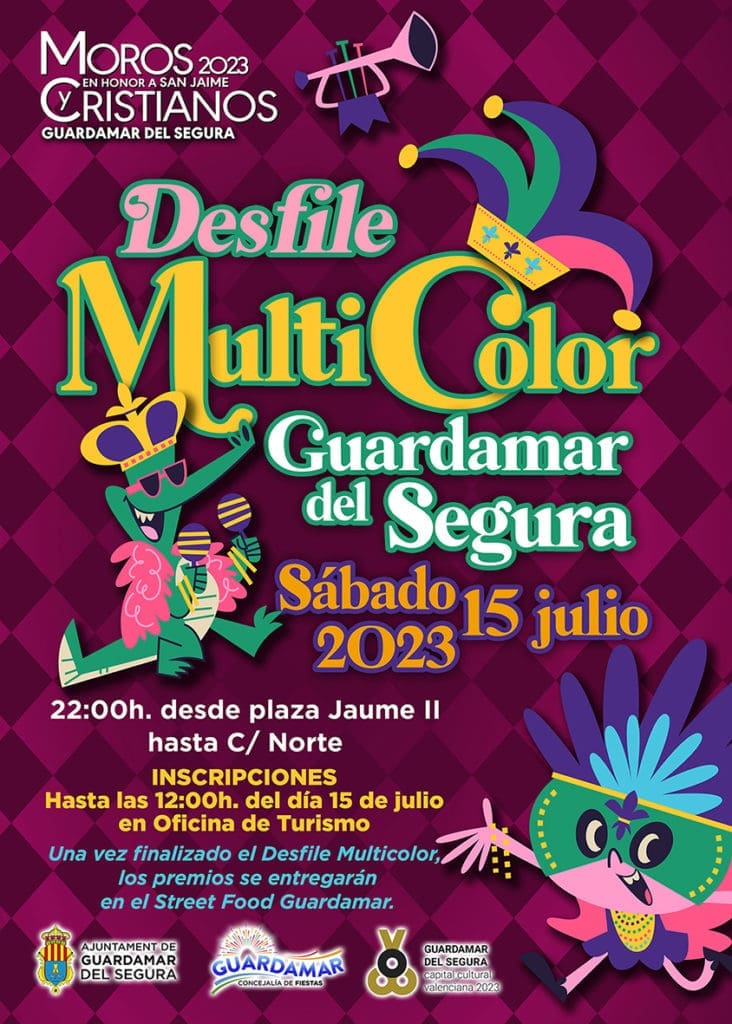 Itinerario: Inicio en la Plaça Sant Jaume, continua por la Avda. País Valencià y finalizará en Carrer Major esquina Carrer Nord. LAS BASES DEL CONCURSO Y DORSALES SE PODRÁN RECOGER EN LA OFICINA DE TURISMO. Una vez finalizado el Desfile Multicolor, los premios se entregarán en el Street Food Guardamar.