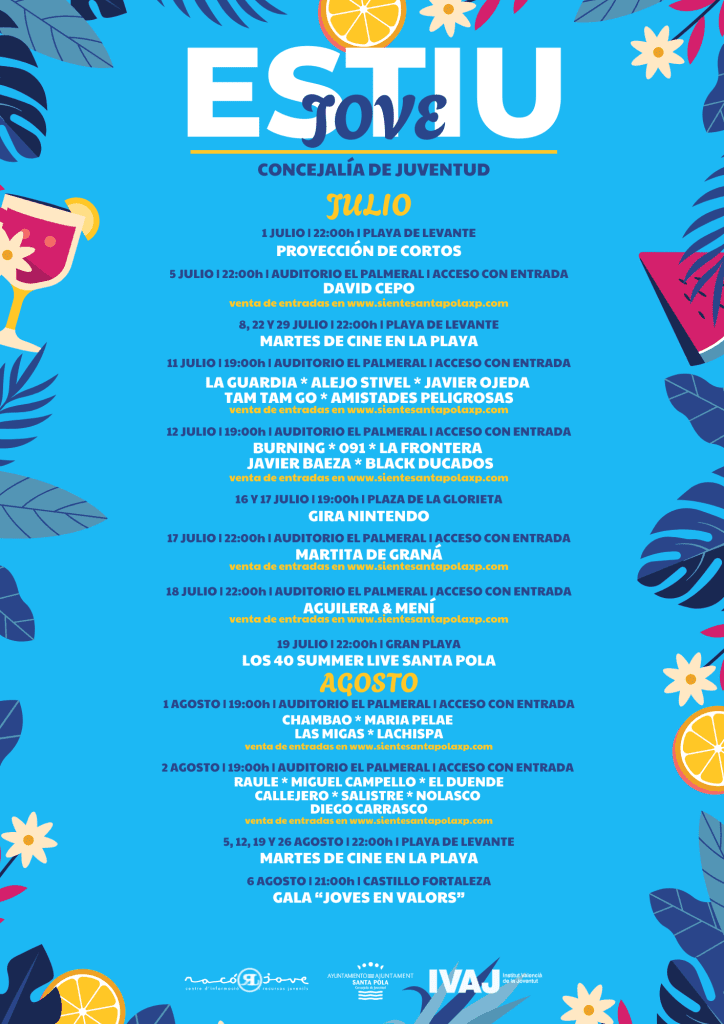 “Estiu Jove” cerrará la programación el 6 de agosto con una nueva edición de la gala “Jovens en Valors” en el Castillo Fortaleza, en la que se rendirá reconocimiento a los jóvenes de Santa Pola que han destacado en diversos ámbitos.