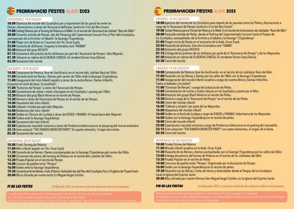 El Parque de los Eucaliptus va a ser el escenario principal de las Fiestas de l’Albir, que se celebran del 18 al 20 de agosto. Habrá un servicio de autobuses nocturno gratuito entre el núcleo urbano, las urbanizaciones y la zona de l’Albir durante todo el fin de semana. “Por unas fiestas más seguras y responsables”.