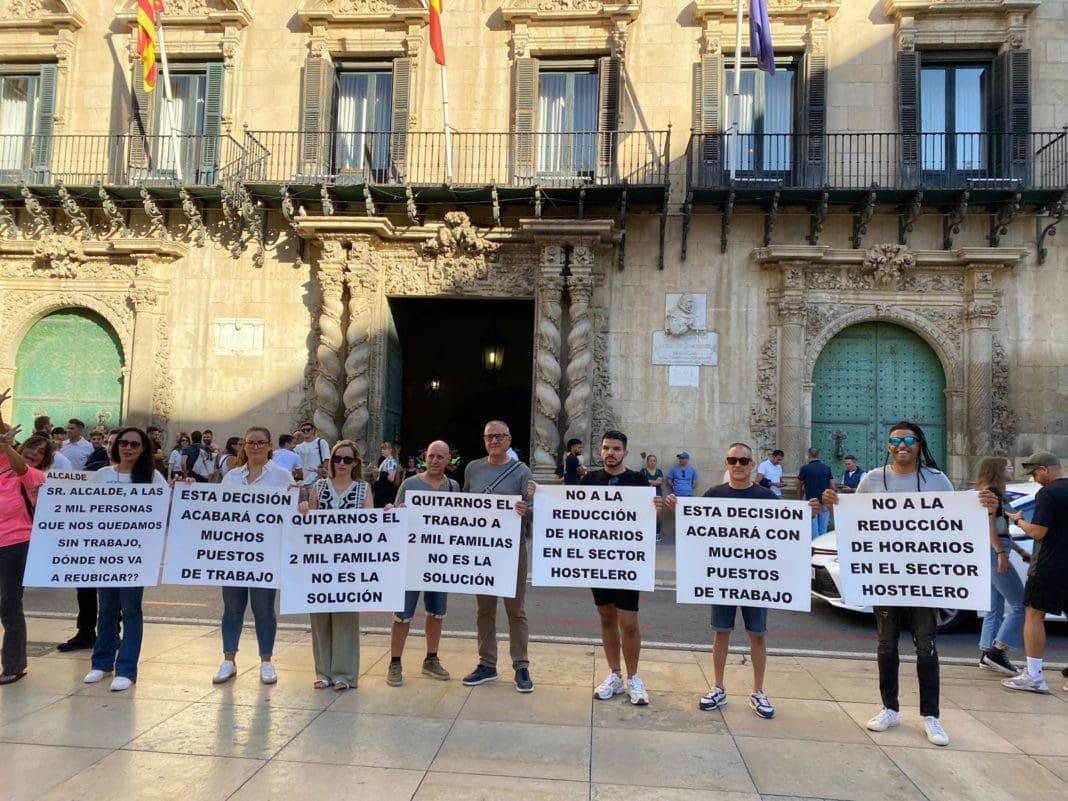 Alrededor de 300 empresarios y trabajadores del sector del ocio y la restauración de Alicante se han congregado hoy pacíficamente frente al Ayuntamiento durante la celebración de pleno municipal. La manifestación, convocada por la Asociación de Locales de Restauración y Ocio de Alicante (ALROA) y las empresas afines del sector, tenía como objetivo expresar su descontento ante las recientes propuestas de reducción de horarios en locales nocturnos.
