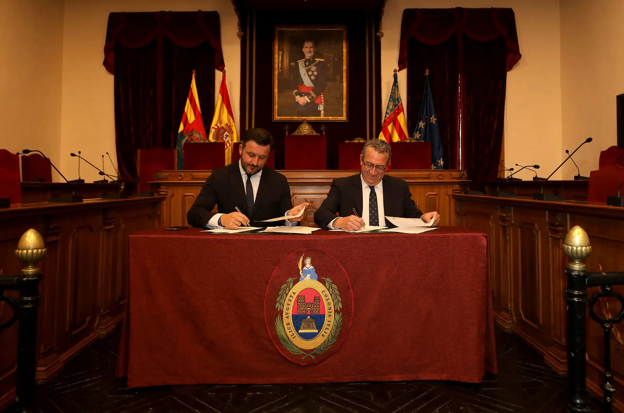 El presidente de la Diputación ha apuntado al respecto, tras firmar primero en el Libro de Honor del Ayuntamiento de Elche, que este protocolo “es un gesto muy importante para la ciudad y para la propia Diputación, que tiene claro que el desarrollo de este palacio dinamizará la comarca y saldará una deuda”.