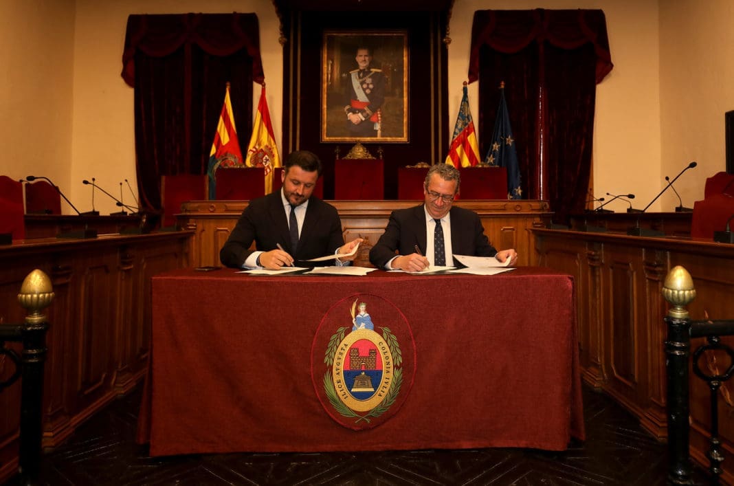 El presidente de la Diputación de Alicante, Toni Pérez, y el alcalde de Elche, Pablo Ruz, han suscrito esta mañana el protocolo general de actuación para la construcción y posterior gestión del Palacio de Congresos de la ciudad, un documento que la institución provincial remitió al consistorio la pasada semana.