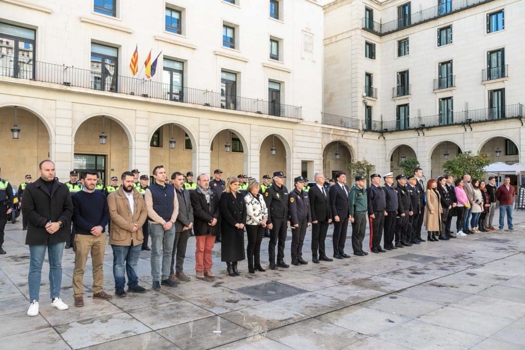 Unos 40 agentes de la Policía Local de Alicante se han unido también al minuto de silencio, que ha contado con la presencia del coronel de la Guardia Civil, José Hernández Mosquera; el subdelegado de Defensa, Juan Bosco Montero Prado; el comandante Naval, Joaquín Vegara; el Comisario del Cuerpo Nacional de Policía, Manuel Lafuente; y los jefes de las policías Autonómica y Local, María Luisa Rodríguez y José María Conesa, respectivamente.
