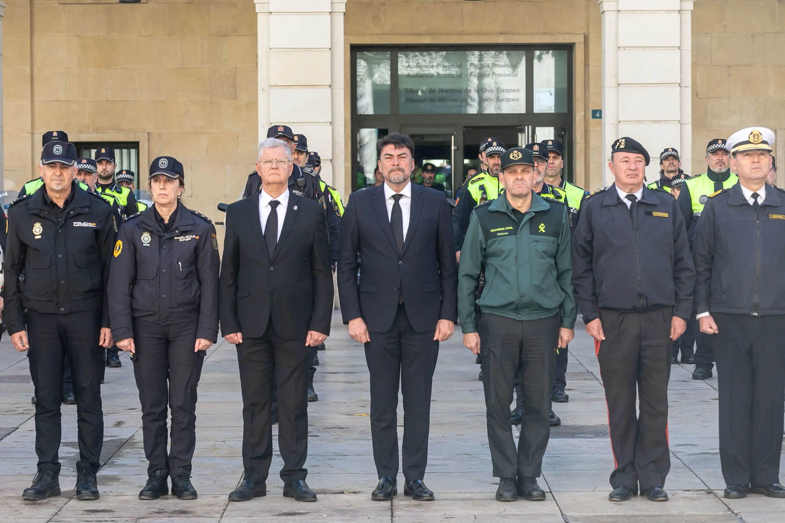 Unos 40 agentes de la Policía Local de Alicante se han unido también al minuto de silencio, que ha contado con la presencia del coronel de la Guardia Civil, José Hernández Mosquera; el subdelegado de Defensa, Juan Bosco Montero Prado; el comandante Naval, Joaquín Vegara; el Comisario del Cuerpo Nacional de Policía, Manuel Lafuente; y los jefes de las policías Autonómica y Local, María Luisa Rodríguez y José María Conesa, respectivamente.