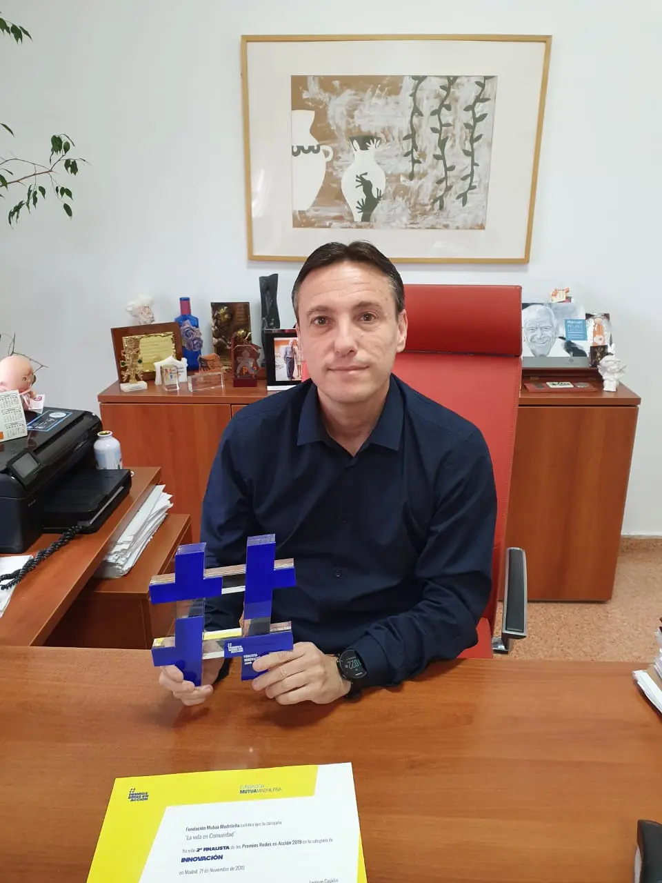 Nicolás Conde portando el trofeo y el diploma de los Premios de la Fundación Mutua Madrileña / Proyecto Hombre