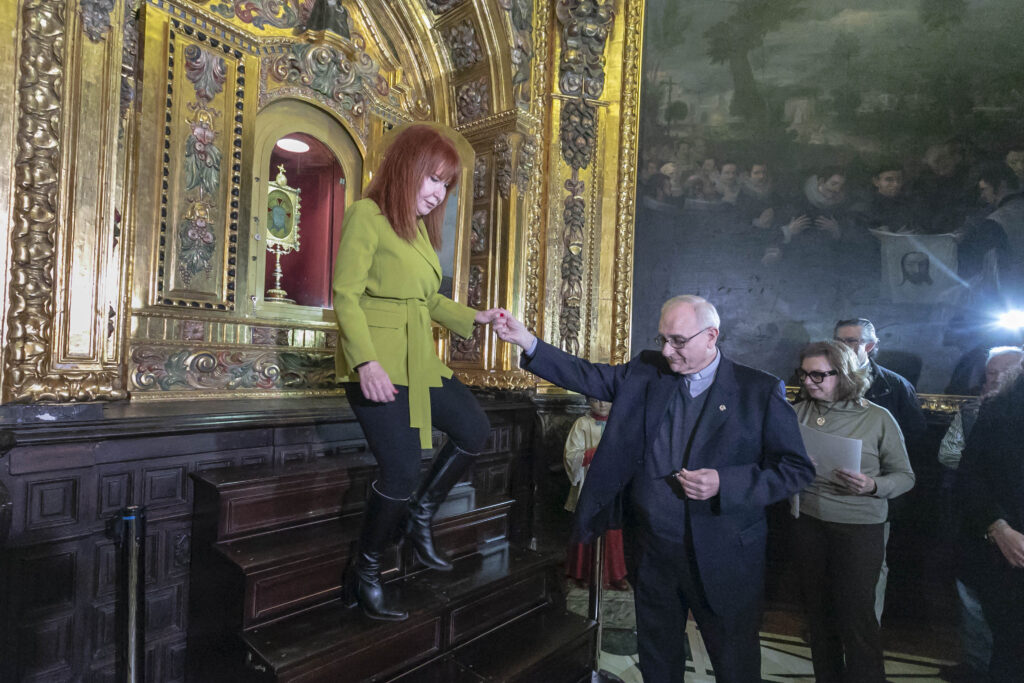 Las concejalas síndicas han abierto la hornacina en la que se guarda la Sagrada Reliquia situada en el camarín con las dos llaves que custodia el Ayuntamiento de Alicante. El capellán Miguel Ángel Cremades ha completado la apertura con las otras dos llaves que se conservan en el Monasterio de la Santa Faz.