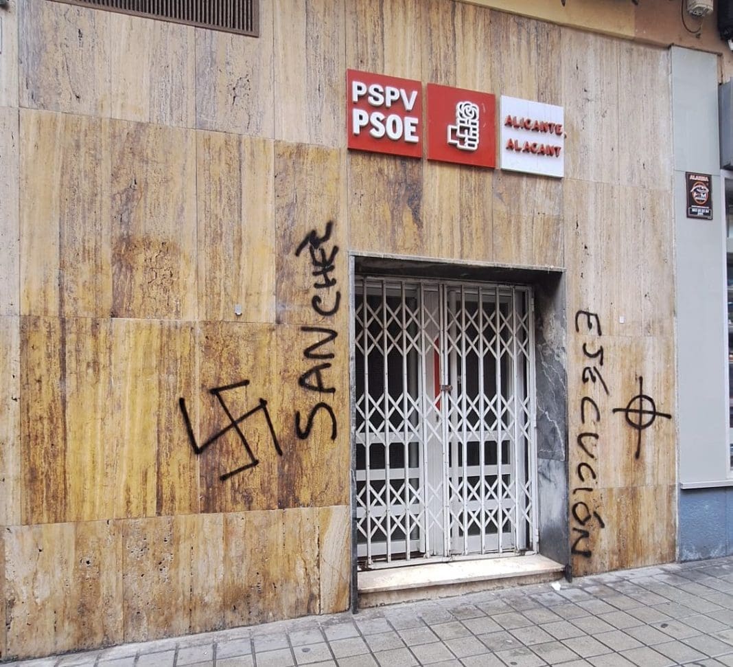 La sede del PSPV-PSOE de la ciudad de Alicante ha amanecido este domingo con unos mensajes fascistas pintados en su fachada, donde se puede ver una esvástica junto a la palabra ‘Sánchez’ y una diana junto a la palabra ‘ejecución’.