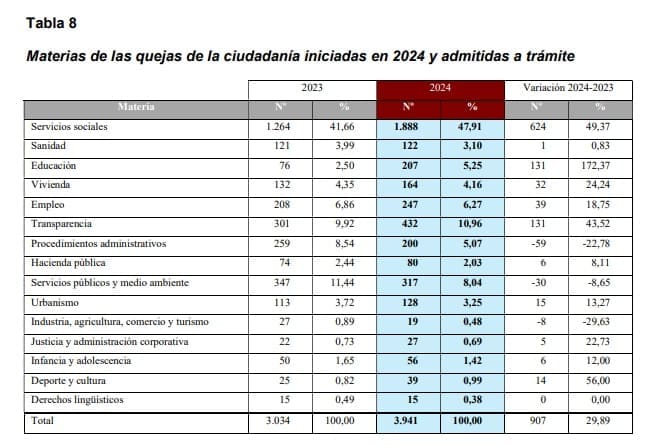 Por otra parte, cabe destacar el descomunal aumento de las quejas en materia de Servicios sociales, más del 49% respecto a 2023, especialmente en la gestión de la dependencia, diversidad funcional y renta valenciana de inclusión. El Síndic lleva pidiendo en los últimos años que se revisen estos procedimientos, pero no se han hecho cambios.