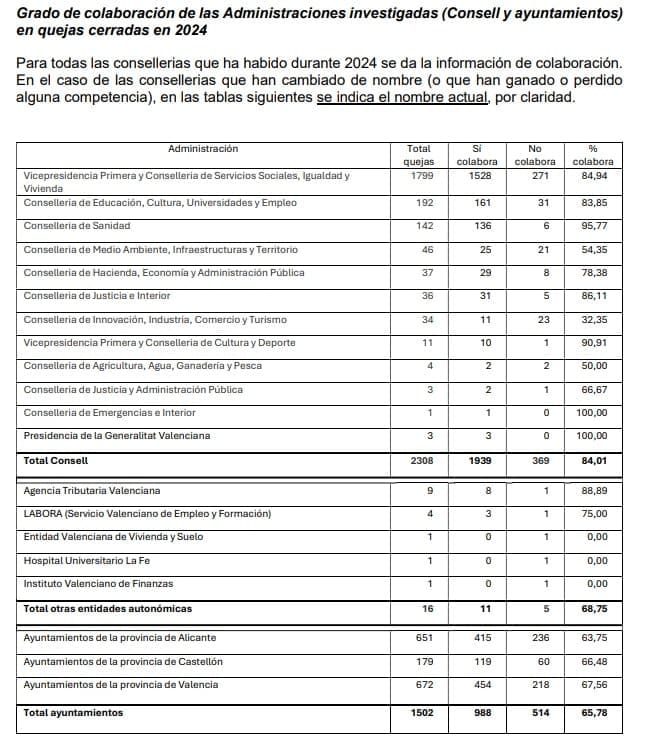 No obstante, la Conselleria de Servicios Sociales, Igualdad y Vivienda, que dirige Susana Camarero es de las más colaboradoras según los datos que proporciona la Sindicatura. En 2024 lo hizo con un 84,94% de los expedientes gestionados. En el ranking de los menos colaboradores, la Conselleria de Innovación, Industria, Comercio y Turismo atendió el 32,35% de las peticiones. Entre las que más aportaron se encuentran el área de Presidencia de la Generalitat y la Conselleria de Emergencias e Interior con el 100% de las solicitudes atendidas.