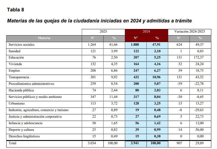 A lo largo del año pasado, las quejas sobre servicios sociales y transparencia fueron las más numerosas, y se han incrementado considerablemente respecto a ejercicios anteriores. Tanto es así que las quejas relativas a Servicios Sociales que ha recibido el Síndic en 2024 ya suponen el 47, 91% del total.