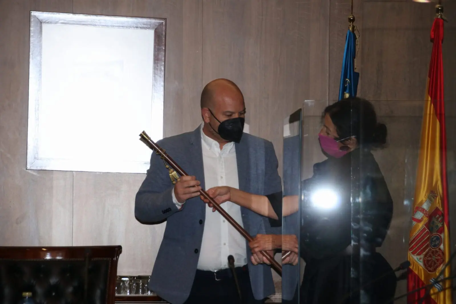 Tras su discurso como nuevo alcalde, Rosa Vila le ha entregado el bastón de mando del Ayuntamiento.