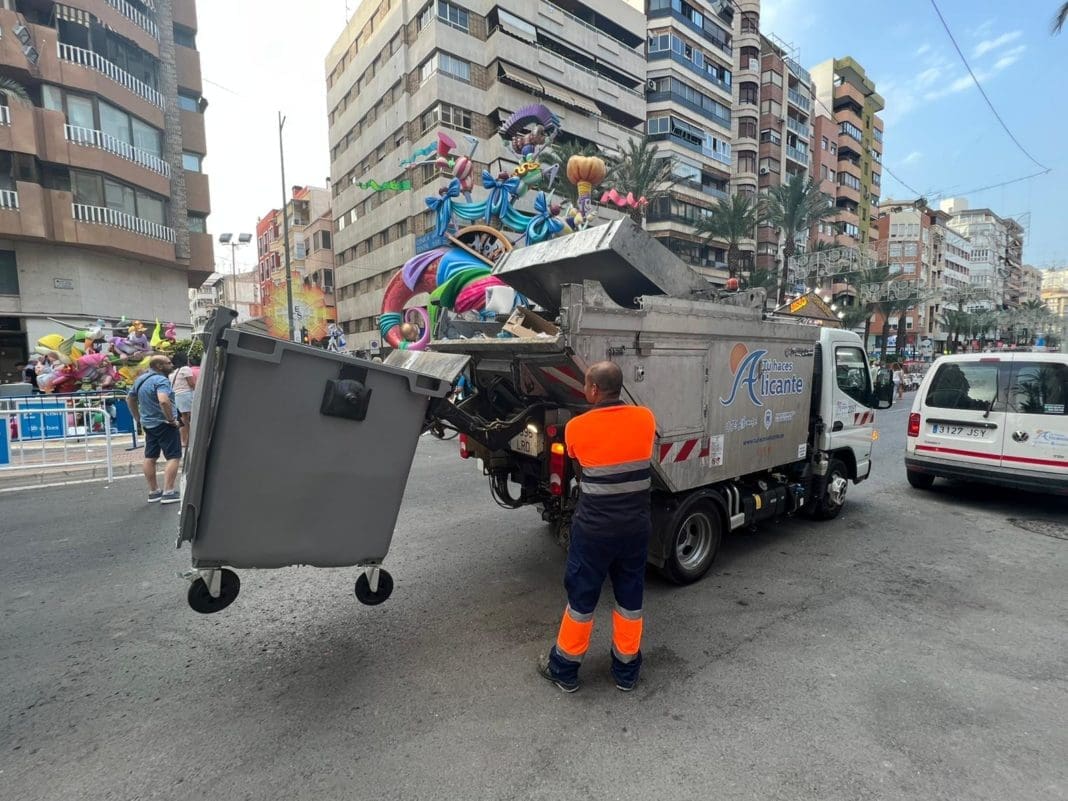 El Ayuntamiento de Alicante junto a la empresa adjudicataria del servicio de recogida de residuos, UTE Alicante, han puesto en marcha para la recogida de contenedores de barracas y racós un operativo especial durante todas las Hogueras para que existan los menos desbordes posibles.
