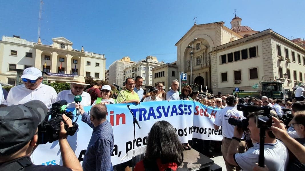 El rechazo a los recortes del agua procedente del trasvase Tajo-Segura ha unido en la plaza de la Montañeta de Alicante a 1.200 profesionales del sector agrario, representantes políticos y agentes sociales de la Comunitat así como del sector en la Región de Murcia y Almería. El acto, bajo el lema «Sin trasvases no aguantaremos. Defiende la huerta de Europa», ha sido convocado por la Asociación Agraria de Jóvenes Agricultores (Asaja) de Alicante, el Sindicato Central de Regantes del Acueducto Tajo-Segura (SCRATS), las comunidades de regantes agrupadas bajo Riegos de Levante Margen Derecha, Riegos de Levante Margen Izquierda y la Junta Central de Usuarios del Vinalopó. Y una de los principales motivos de denuncia es el recorte de más de un 40% de los caudales a Alicante, Murcia y Almería, que supone la supresión de 108Hm cúbicos anuncian los organizadores. La medida del Ministerio de Transición Ecológica aboca al campo a «la muerte efectiva de la huerta de Europa”, según José Vicente Andreu, presidente de ASAJA Alicante.