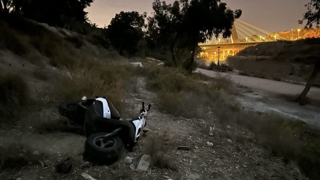 Una dotación de la Policía Local encontró un ciclomotor tumbado en el suelo mientras realizaba labores de vigilancia y prevención por la ladera del río Vinalopó.
