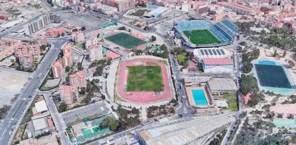 El estadio de atletismo municipal se encuentra en el corazón de la Ciudad Deportiva y ocupa una superficie total de 29.000 metros cuadrados. Integra un conjunto que se completa con el estadio de fútbol José Rico Pérez, el Centro de Tecnificación y los pabellones deportivos Pitiu Rochel y Rafael Pastor, además de los campos de entrenamiento del antiguo hipódromo. Además de la pista de atletismo, alberga un campo de césped natural en su parte central utilizado, además de para la práctica del atletismo, para partidos de fútbol.