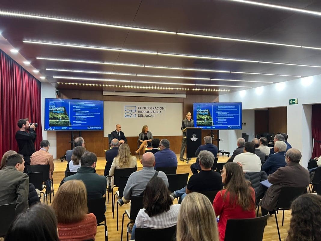 La delegada del Gobierno en la Comunitat Valenciana, Pilar Bernabé, junto con el presidente de la Confederación Hidrográfica del Júcar, Miguel Polo, ha presentado a las comunidades de regantes la jornada del PERTE de digitalización del ciclo del agua.