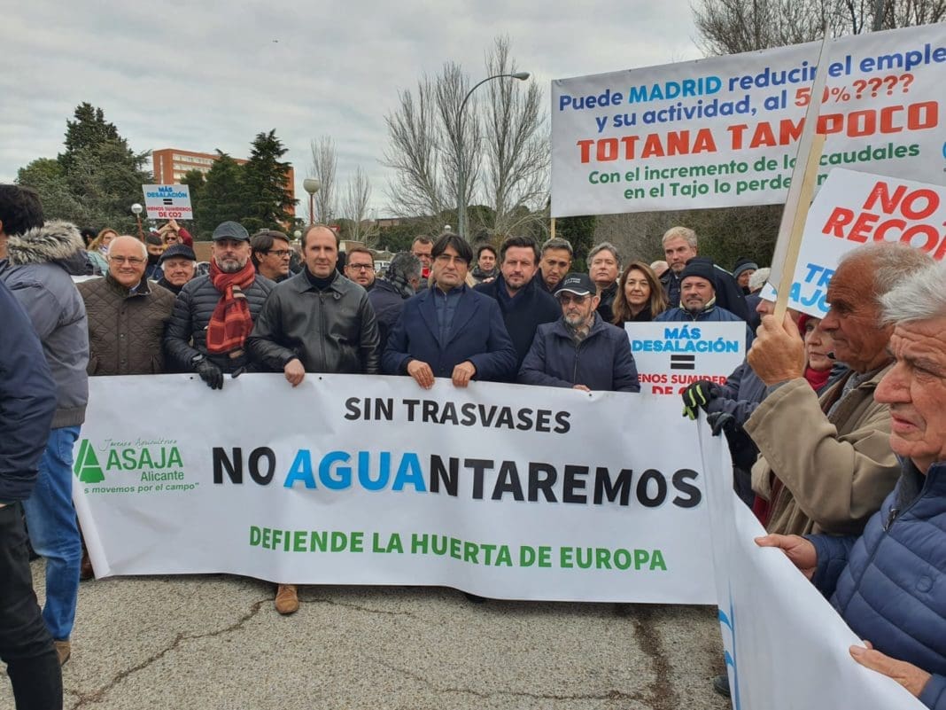 Representantes de regantes de Almería, Murcia y Alicante se han concentrado frente al Palacio de la Moncloa en un último intento de que el Consejo de Ministros vote en contra del real decreto que incluye el Plan Hidrológico del Tajo, cuya nueva regulación prevé el recorte de agua para riego del río Segura.
